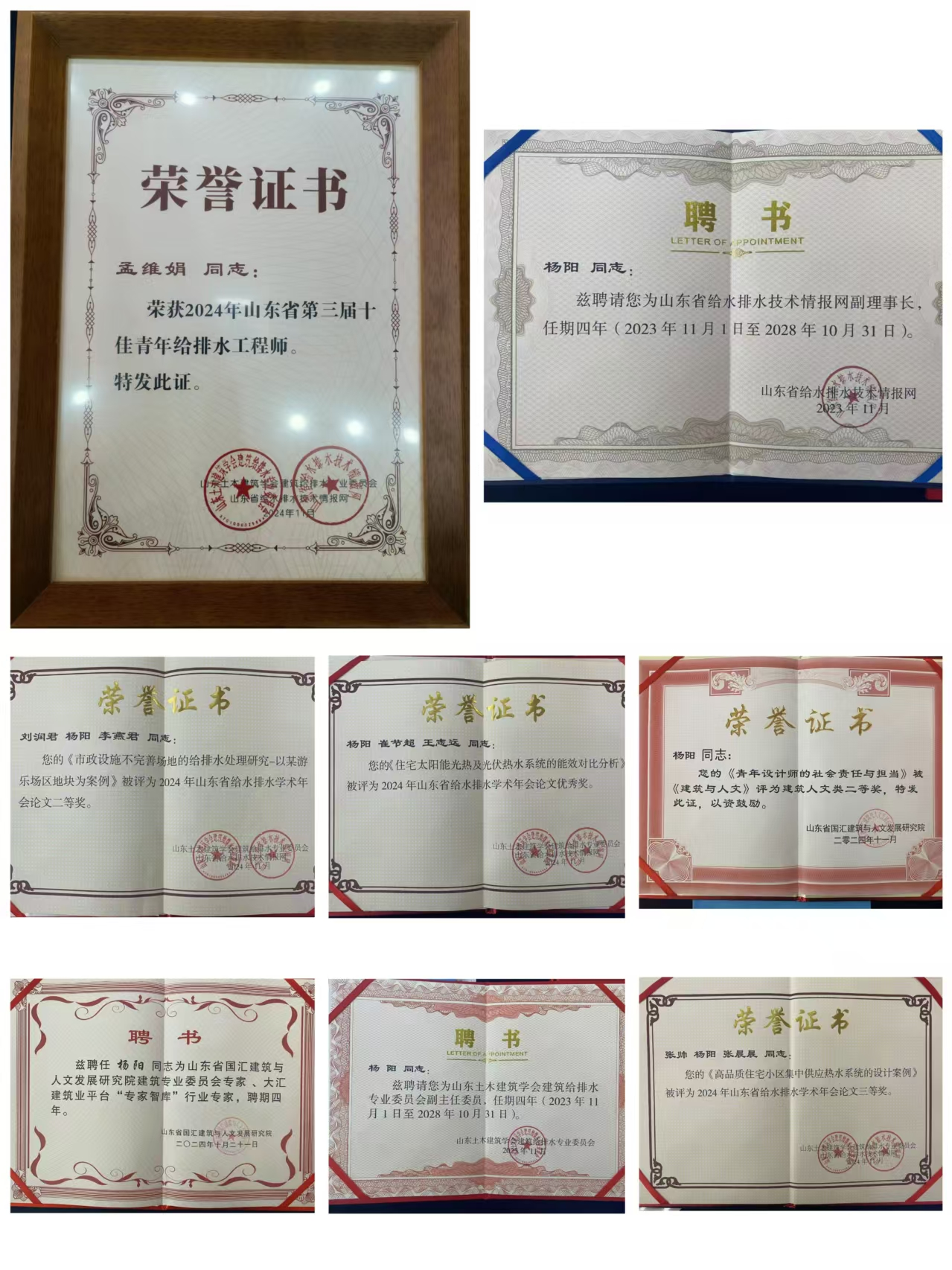 各位專業(yè)人員齊聚年會(huì),圍繞給排水行業(yè)發(fā)展,分享各自實(shí)踐經(jīng)驗(yàn),探尋行業(yè)高質(zhì)量發(fā)展的方法與途徑。我公司給排水設(shè)計(jì)人員榮獲多個(gè)獎(jiǎng)項(xiàng)。孟維娟榮獲“山東省十佳青年給排水工程師”稱號(hào)。楊陽(yáng)被聘為山東土木建筑學(xué)會(huì)建筑給排水專業(yè)委員會(huì)副主任委員、山東省給水排水技術(shù)情報(bào)網(wǎng)副理事長(zhǎng)、山東省國(guó)匯建筑與人文發(fā)展研究院建筑專業(yè)委員會(huì)專家、大匯建筑業(yè)平臺(tái)“專家智庫(kù)”行業(yè)專家。劉潤(rùn)君、楊陽(yáng)、李燕君撰寫論文《市政設(shè)施不完善場(chǎng)地的給排水處理研究-以某游樂(lè)場(chǎng)區(qū)地塊為案例》被評(píng)為 2024年山東省給水排水學(xué)術(shù)年會(huì)論文二等獎(jiǎng)。張帥、楊陽(yáng)、張晨晨撰寫的論文《高品質(zhì)住宅小區(qū)集中供應(yīng)熱水系統(tǒng)的設(shè)計(jì)案例》被評(píng)為 2024 年山東省給水排水學(xué)術(shù)年會(huì)論文三等獎(jiǎng)。楊陽(yáng)、崔節(jié)超、王志遠(yuǎn)撰寫的論文《住宅太陽(yáng)能光熱及光伏熱水系統(tǒng)的能效對(duì)比分析》被評(píng)為2024年山東省給水排水學(xué)術(shù)年會(huì)論文優(yōu)秀獎(jiǎng)。楊陽(yáng)撰寫的《青年設(shè)計(jì)師的社會(huì)責(zé)任與擔(dān)當(dāng)》被《建筑與人文》評(píng)為建筑人文類二等獎(jiǎng)。