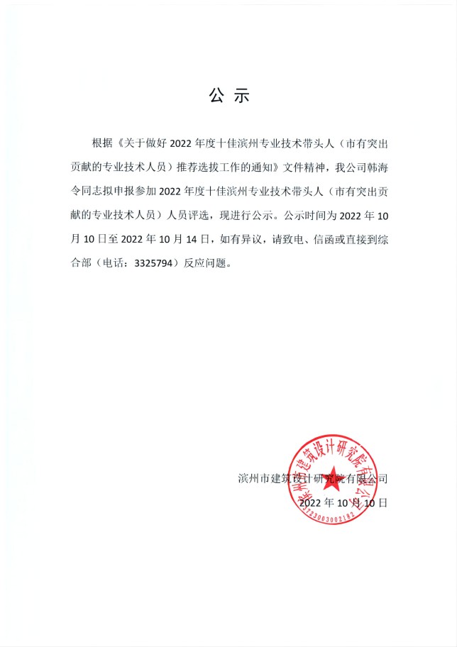 韓海令同志擬申報(bào)參加2022年度十佳濱州專業(yè)技術(shù)帶頭人評(píng)選的公示